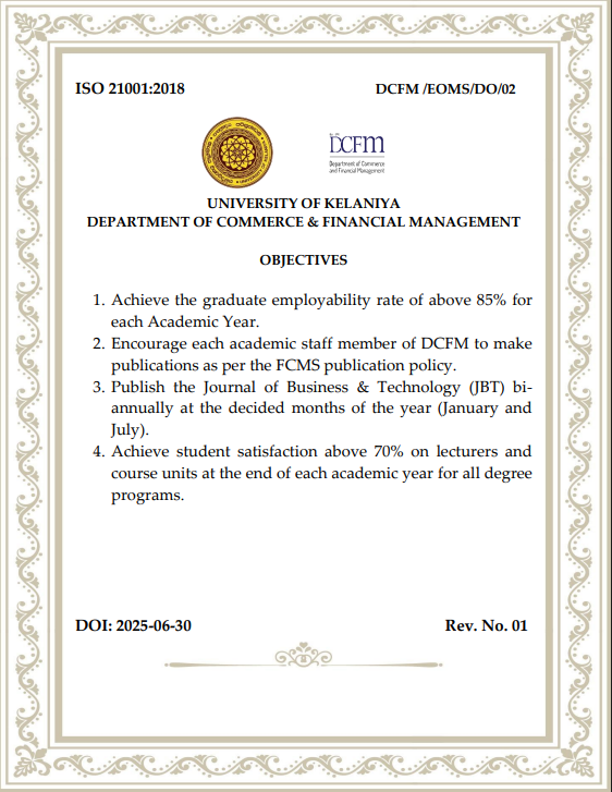 "It is my great pleasure to welcome you to the Department of Commerce and Financial Management (DCFM) at the University of Kelaniya. As the founder of the Commerce and Management education at the University of Kelaniya, we value our intellectual capital and utilize traditional as well as contemporary ways and means for the comprehensive development of our students' personalities. Thus every year, the society at large is benefitted from well-equipped academics who can significantly contribute to our nation's value creation.