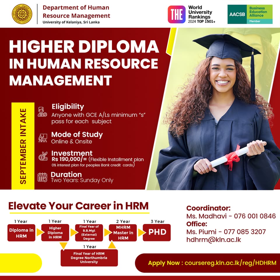 The Department of Human Resource Management is the national arm that has pioneered HRM education in Sri Lanka with notable landmarks since its inception in 1995. Some of these landmarks are introducing the Bachelor of Business Management (Human Resource Management) degree in 1995; initiating the nation’s first postgraduate diploma in HRM and Master of Human Resource Management degree programmes in 2005 and 2010 respectively. Further, the department has contributed to the development of the HRM profession by offering a Bachelor of Business Management, General (External) Degree Programme for external students which commenced in 1999, and a Higher Diploma in HRM established in 2015. The department also launched the first HRM journal in 2004, while providing leadership for many innovative events. Further, the Department enrolls students to pursue PhD degrees under the supervision of senior academics of the department.