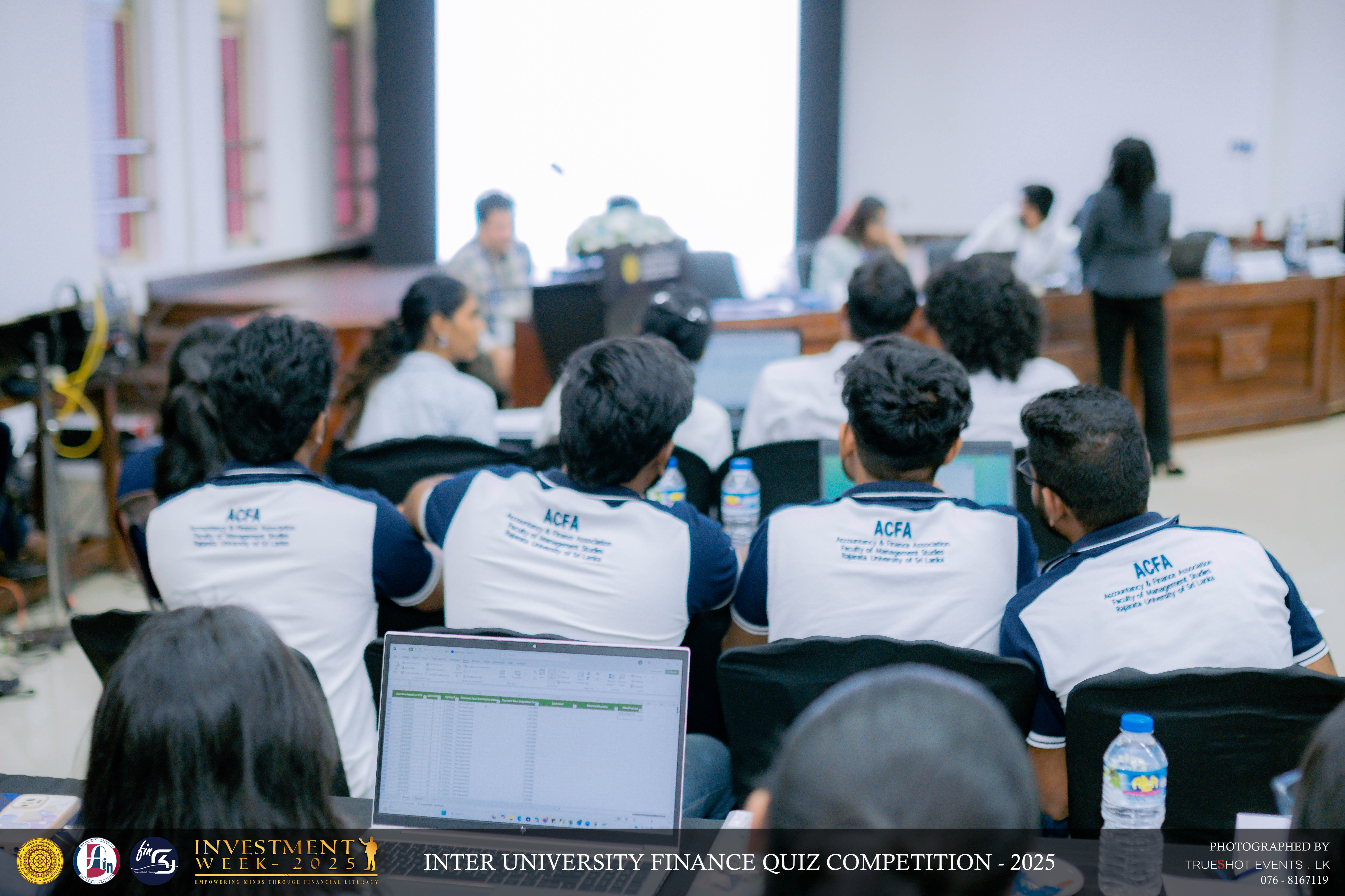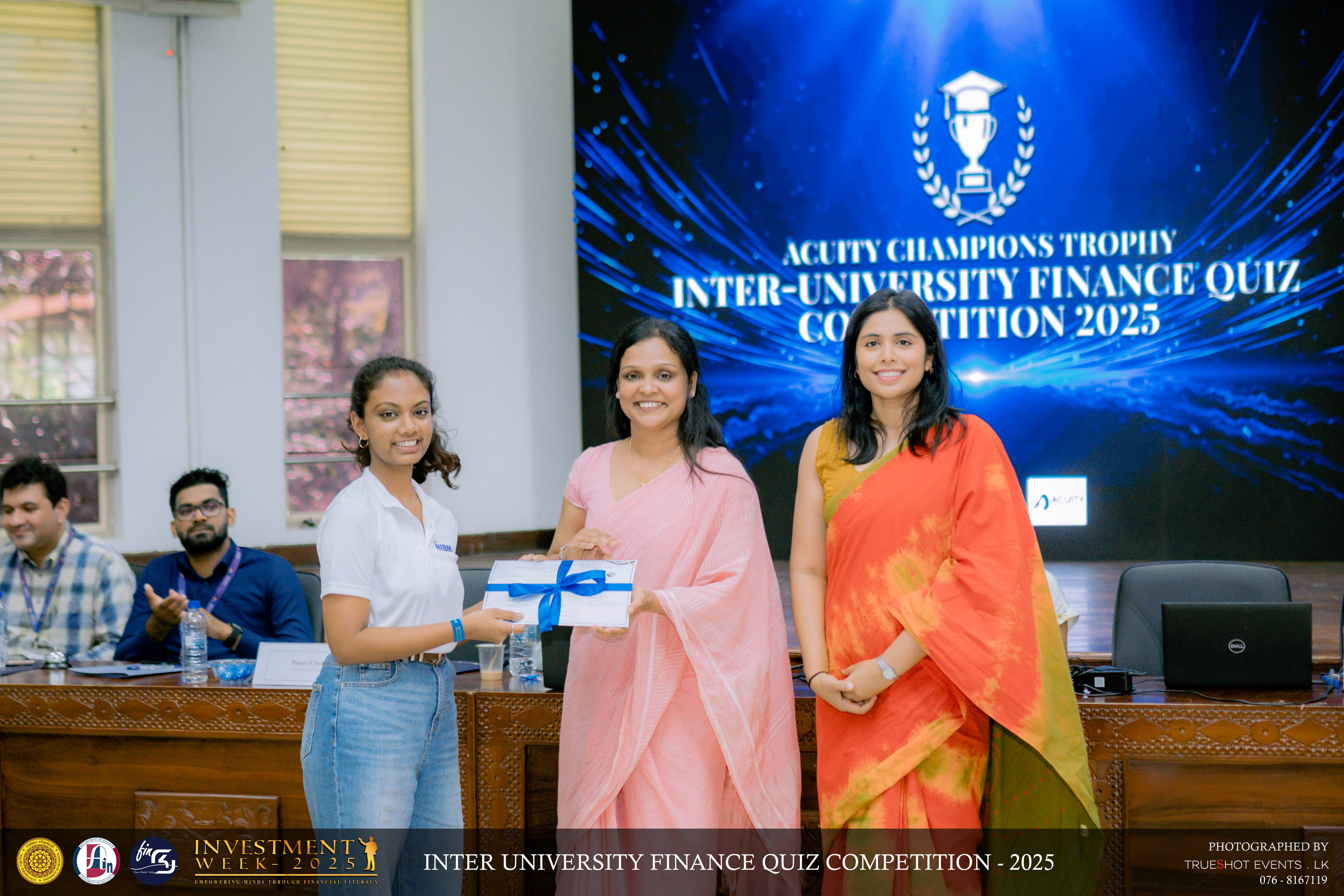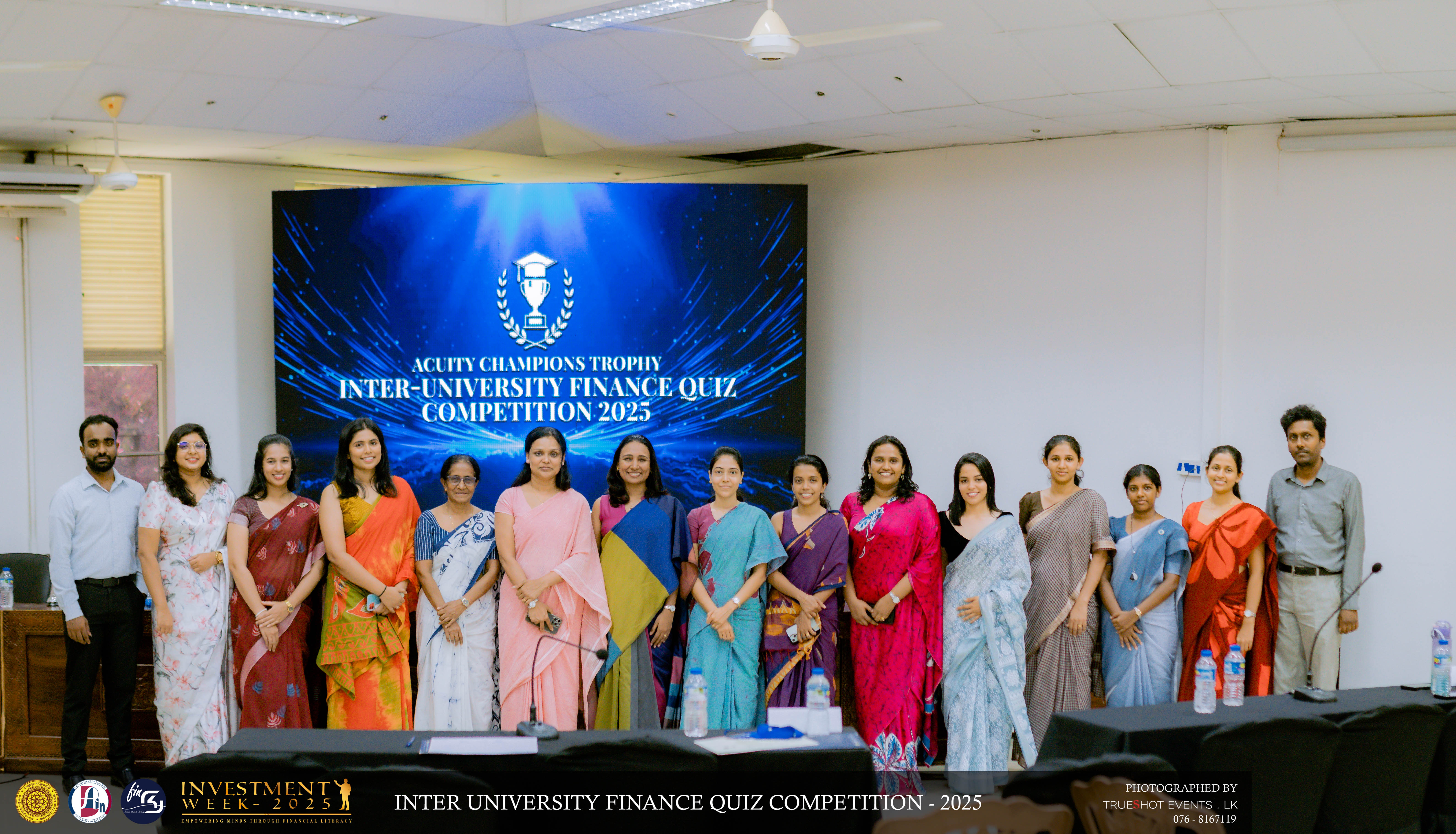 Continuing the series of impactful events under Investment Week 2025 the Acuity Champions Trophy, Inter-University Finance Quiz Competition 2025 was held on the morning of 16th October, bringing together the brightest young minds in finance from universities across Sri Lanka. Conducted in collaboration with Acuity Knowledge Partners, the competition brought together 22 teams from state and private universities across Sri Lanka to showcase their knowledge in finance, economics, investments, and current affairs.